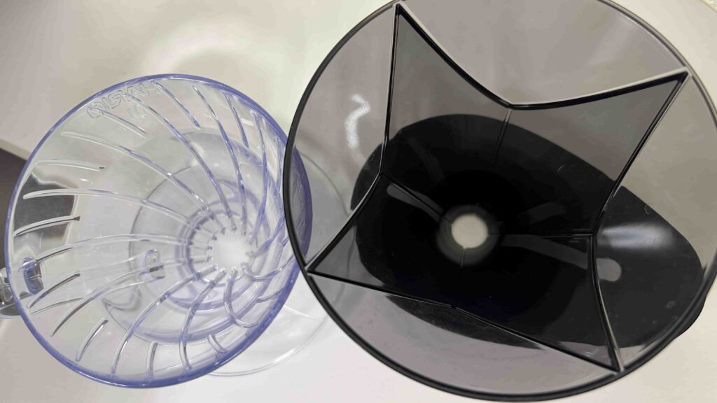 写真のように、内側は一般的なV60ほど大きなリブが目立たず、ほぼ平らな構造になっています。
